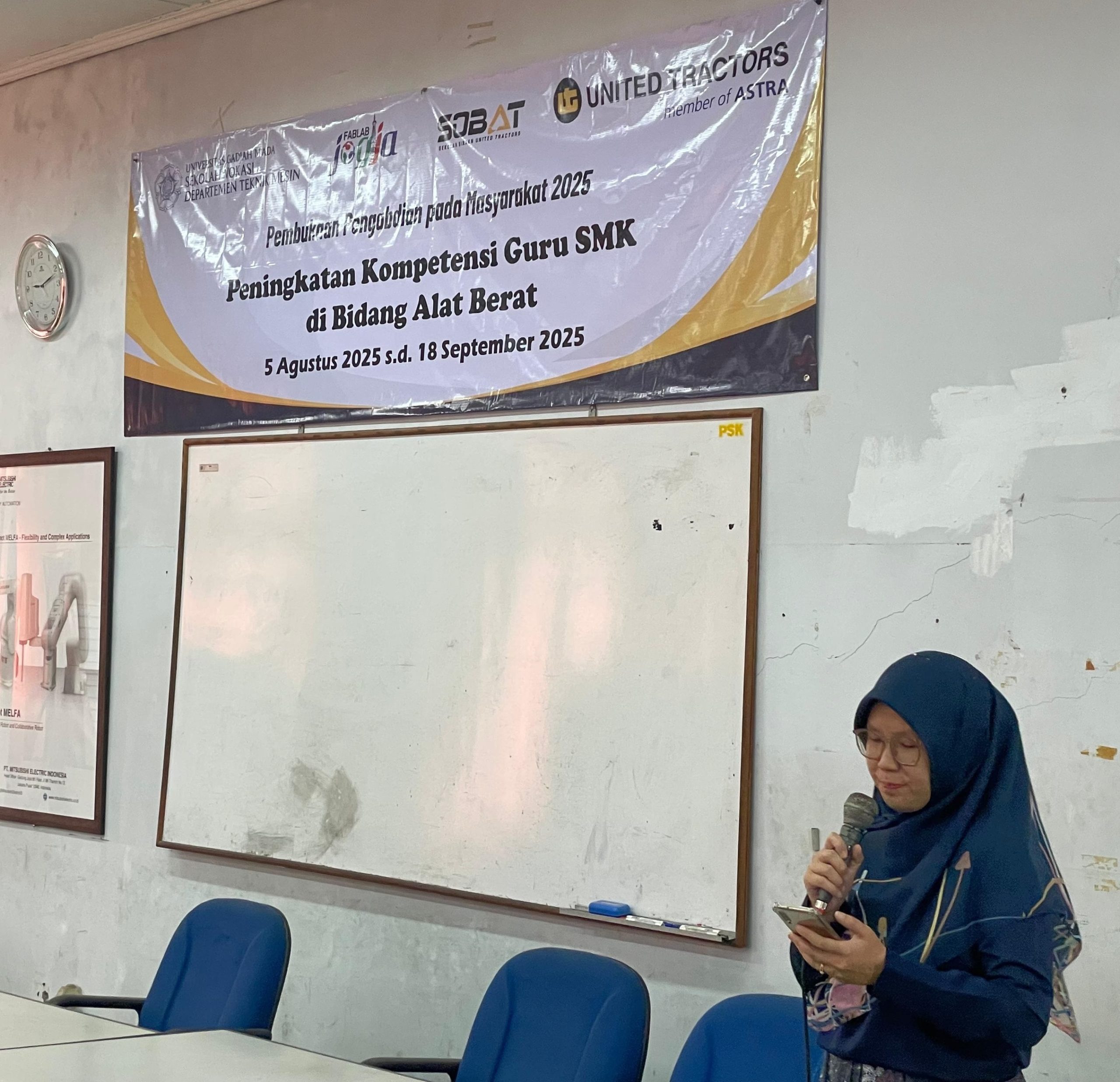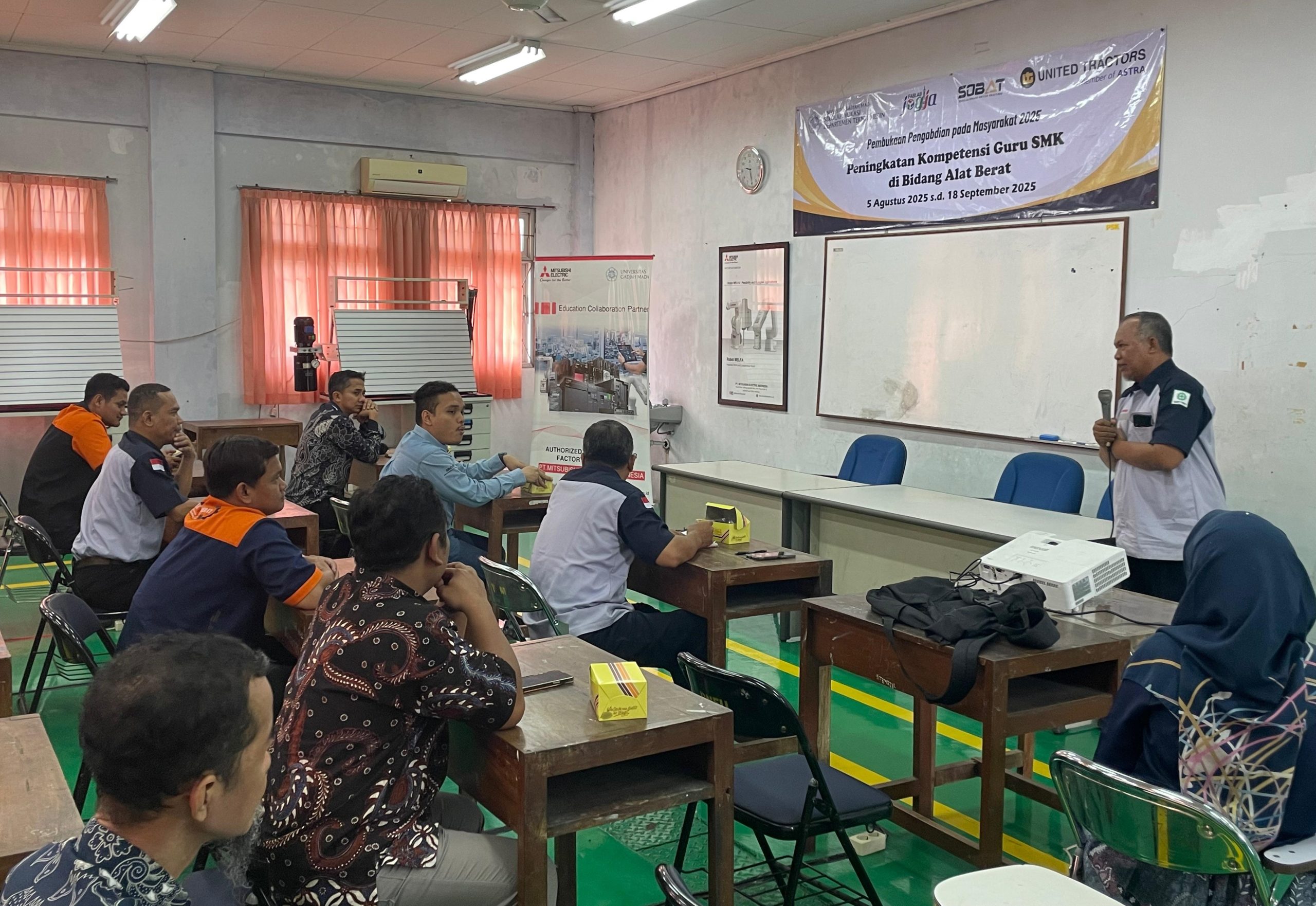 Kegiatan resmi dibuka pada 18 Agustus 2025 di Kampus Sekip, DTM SV UGM, dan dihadiri oleh pihak akademik, perwakilan industri, dan peserta pelatihan. Dalam sambutannya, Ketua Departemen Teknik Mesin SV UGM, Dr. Lilik Dwi Setyana, menekankan pentingnya peningkatan kapasitas pendidik dalam menghadapi tantangan industri. Perwakilan dari PT United Tractors, Bapak Josua, dan perwakilan peserta, Bapak Samsu Sartana dari SMKN 1 Ngawen, turut memberikan sambutan apresiatif. Kegiatan secara resmi dibuka oleh Dr. Ir. Sugiyanto, selaku Ketua Program Studi Sarjana Terapan Teknik Pengelolaan dan Perawatan Alat Berat.