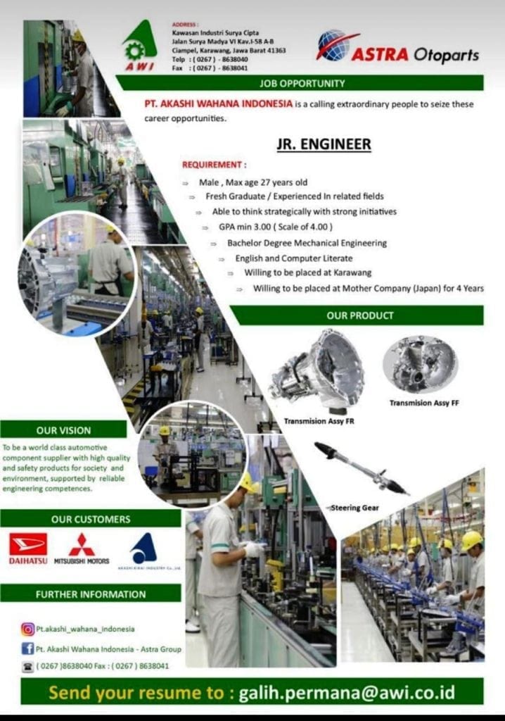 PT. Akashi Wahana Indonesia Info Lowongan Kerja 20 Juli 2018, 11.23 Oleh: sap2_mesin 0 Tags: Akashi Indonesia Lowongan Astra Mechanical Engineering