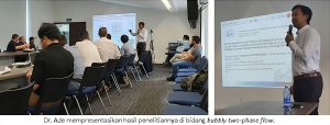 Dr. Eng. Yosephus Ardean K Prayitno, Dosen Departemen Teknik Mesin Sekolah Vokasi UGM, berkesempatan mempresentasikan hasil penelitiannya selama berkolaborasi dengan Prof. Masahiro Takei, Chiba University, Jepang. Pada kesempatan tersebut, Dr. Ade, nama panggilannya, mempresentasikan dua karya terkait bidang bubbly two-phase flow dan battery slurry mixing.