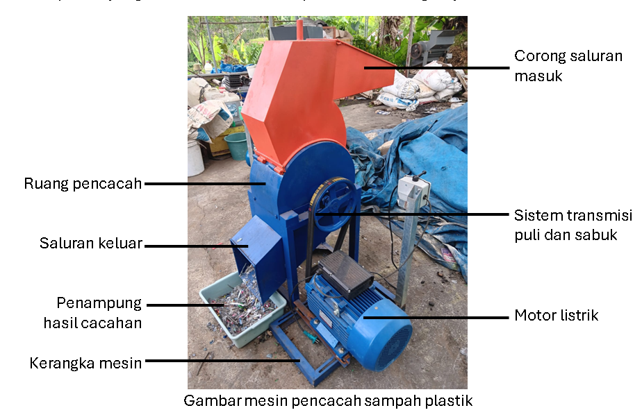 Melalui program ini, tim DTM SV UGM merancang dan membuat mesin pencacah plastik yang mengacu pada hasil penelitian terdahulu. Mesin tersebut berfungsi mencacah sampah botol dan gelas plastik bekas kemasan minuman menjadi potongan berukuran 1–1,5 cm. Proses pembuatan meliputi tahapan perencanaan, perancangan, manufaktur, pengujian kinerja, serta evaluasi hasil. Berdasarkan uji coba, mesin bekerja dengan baik dan mampu menghasilkan cacahan plastik yang memenuhi kebutuhan proses daur ulang lanjutan.