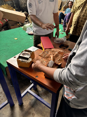 Kegiatan diawali dengan diskusi intensif dengan Pokdarwis Pogo Wijaya untuk menentukan prioritas kebutuhan warga. Dari hasil diskusi, disepakati untuk membangun sebuah sanggar wisata edukasi pande kriya tembaga. Implementasinya dimulai dengan perancangan dan pembuatan meja kerja khusus serta matras (cetakan) yang mengadopsi pola khas daerah, seperti gambar sapi ndeprok khas Boyolali dan motif daun. Alat bantu ini memungkinkan pengunjung, terutama pelajar, untuk mempraktikkan pembuatan souvenir seperti gantungan kunci atau plakat dalam waktu singkat.