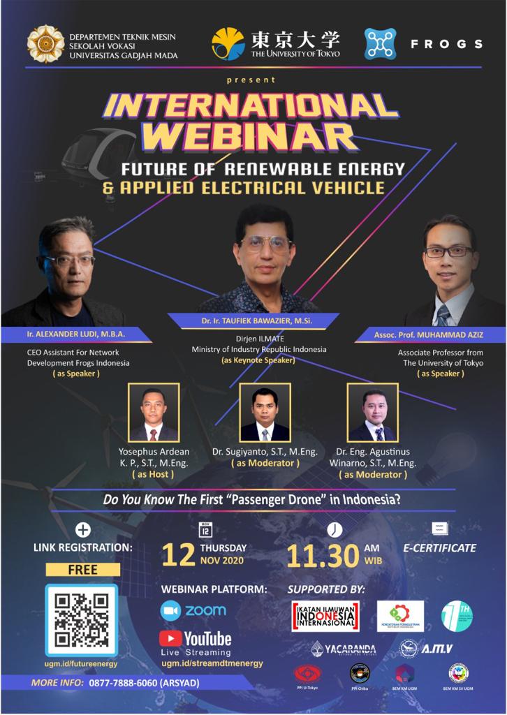 Hello Fellas‼️Departement of Mechanical Engineering, Vocational School Universitas Gadjah Mada proudly present International Webinar. With our greatest theme “Future of Renewable Energy and Applied Electrical Vehicle”, don’t wait to register yourself.