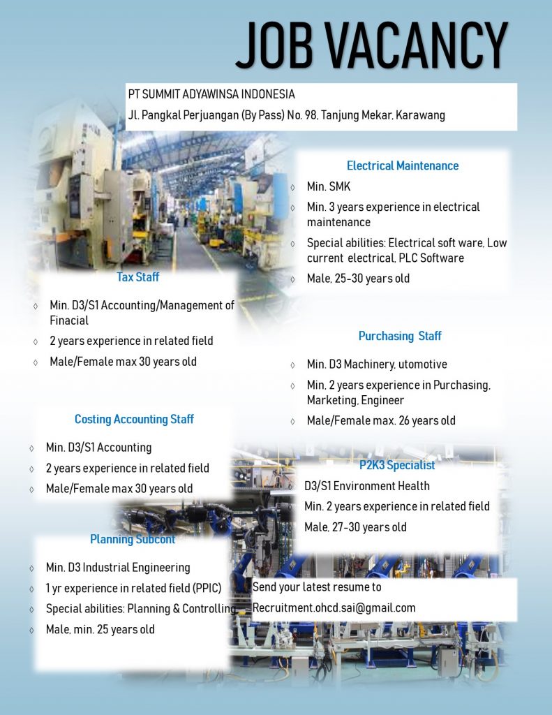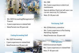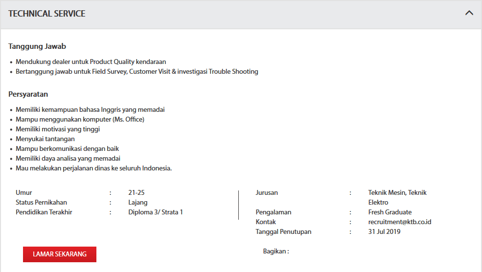 | 15. | MECHANICAL SPECIALIST – SHOPS | D4/S1 | Min. 4 tahun | 1 Agustus 2019 |